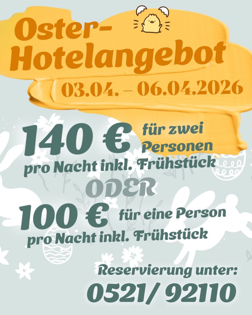 Doch nicht nur Erholungssuchende kommen bei uns auf ihre Kosten: Aktivurlauber dürfen sich auf zahlreiche Freizeitmöglichkeiten freuen. Der berühmte Hermannsweg liegt nur wenige Schritte entfernt, und auch die historische Sparrenburg erreichen Sie in kürzester Zeit zu Fuß.